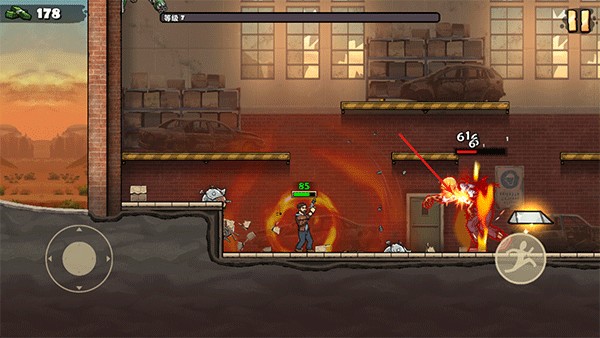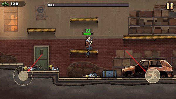 1、进入战车撞僵尸地牢游戏后,左侧的摇杆控制人物移动,右侧按钮跳跃;