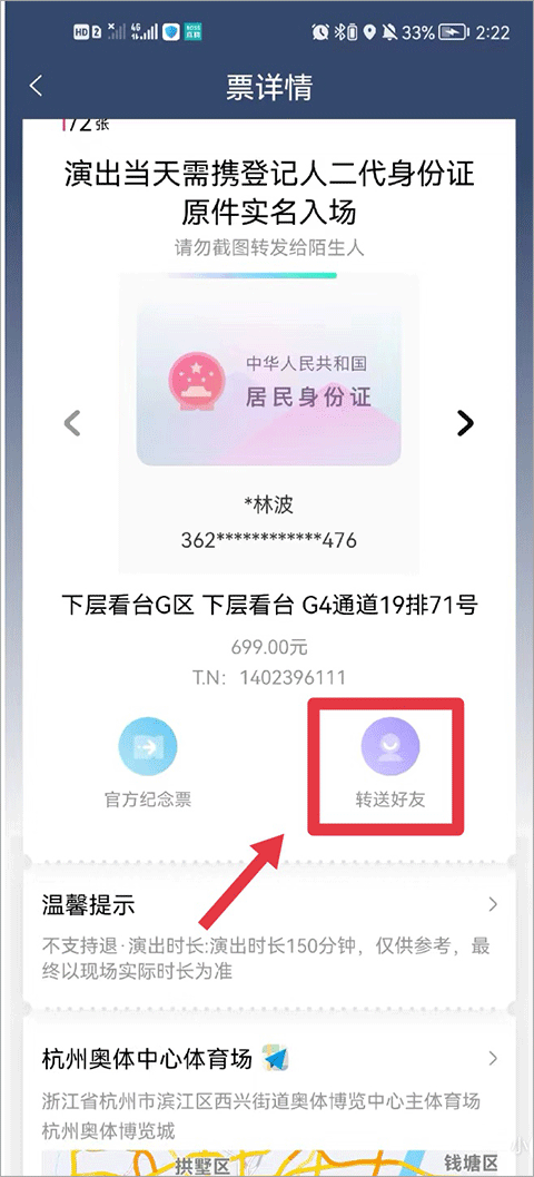 3、然后选择你要转送的票以及接受人信息后点击转送好友