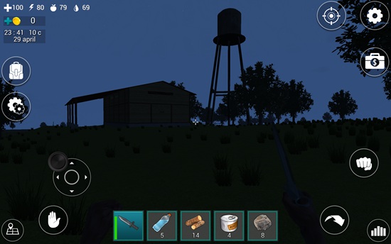 6、我们沿着海岸线朝着水塔走去,在路上可以用匕首对着树干,然后点击右侧“拳头”攻击按钮,可以获得木头,这是后期生存所必备的材料。