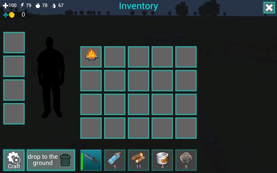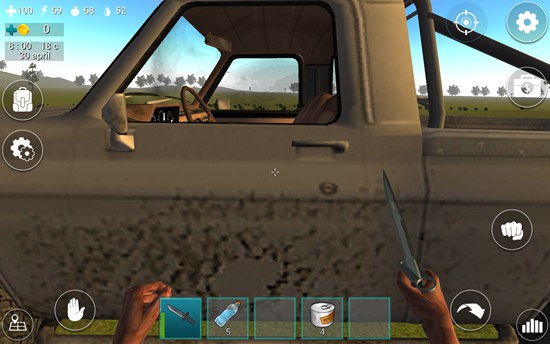 1、在屏幕下方的道具栏中有一把匕首,我们点击匕首即可拿在手中。在屏幕左上角有四个图标数字,分别表示血量、体力值、饥饿值、口渴值。