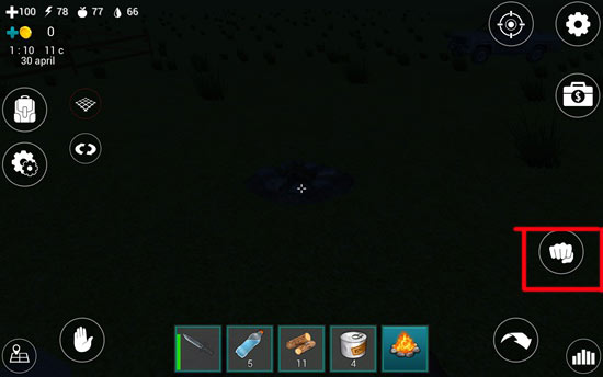 14、点击道具栏中的火堆,它就会出现在我们手中,然后放到合适位置后,点击屏幕右侧的“拳头”攻击按钮,即可安放好火堆。