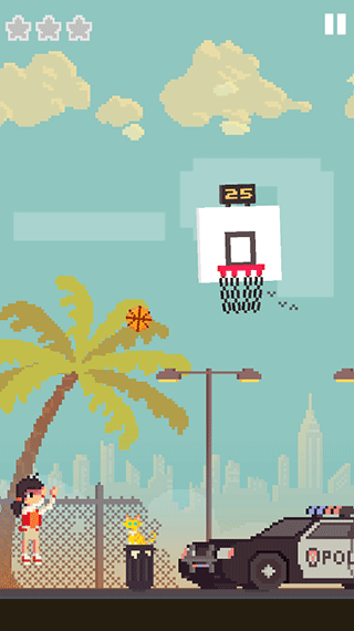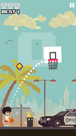 玩家的任务就是控制小男孩进行投篮,玩家只需要按住屏幕,从小男孩到篮筐之间就会自动出现一道弧线,玩家移动手指即可调整弧线的角度和长度,松开手后篮球就会沿弧线自动飞出。球飞入篮筐即可获得一分,一旦投失就只能从头再来了。