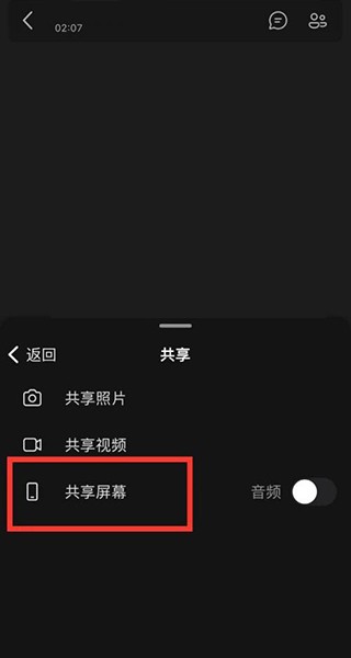 2、选择共享屏幕选项。