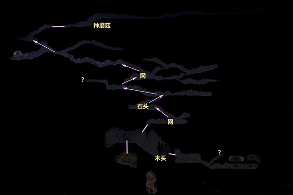 用锄头挖通路,前方又是一个上不去的高台,之前观察那个紫色绿色蘑菇长在一起的蘑菇洞,发现找空地将两种蘑菇相邻会种出一朵大蘑菇。