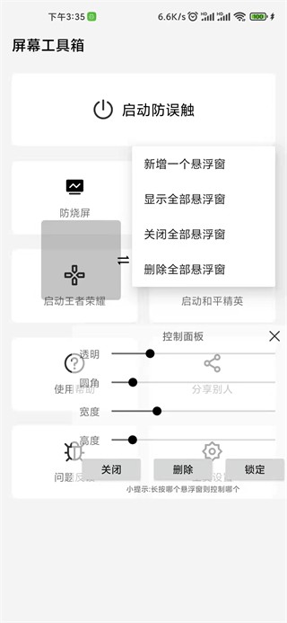 点击首页“启动防误触”再次启用悬浮窗后,将弹出管理菜单,允许添加新悬浮窗、显示或关闭全部悬浮窗、删除全部悬浮窗等操作。