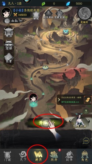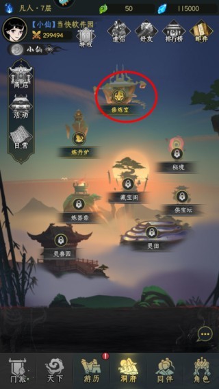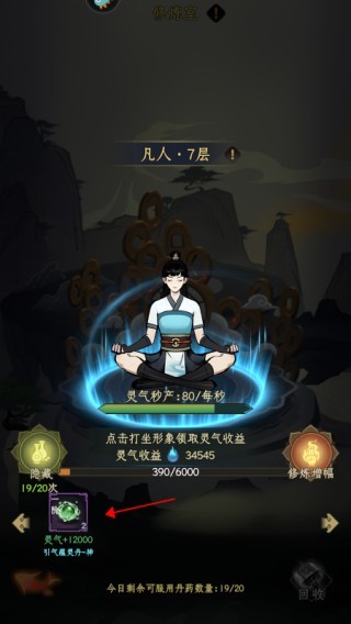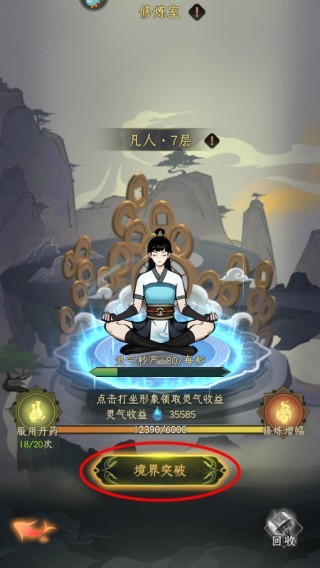 6、此外,主角的提升也相当重要,玩家点击正在修炼的主角可以收集灵气,灵气满后即可进行境界突破,提高修为阶级。