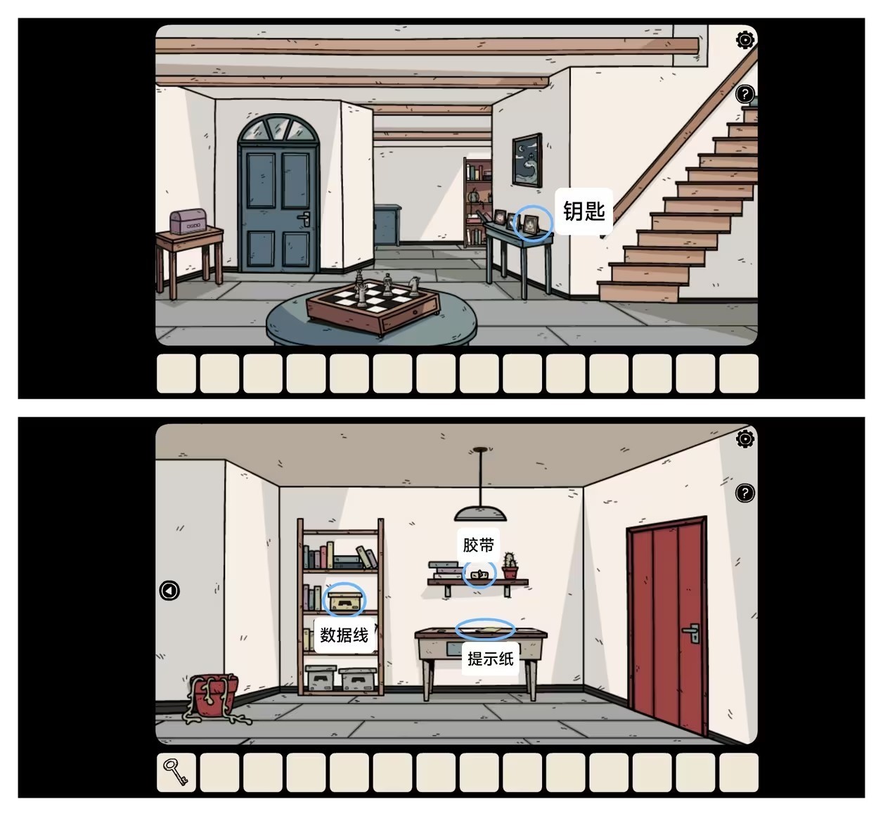 1、拿走相框背后的「生锈的钥匙」,再到二楼右侧拿走「数据线」、「胶带」以及「提示纸」
