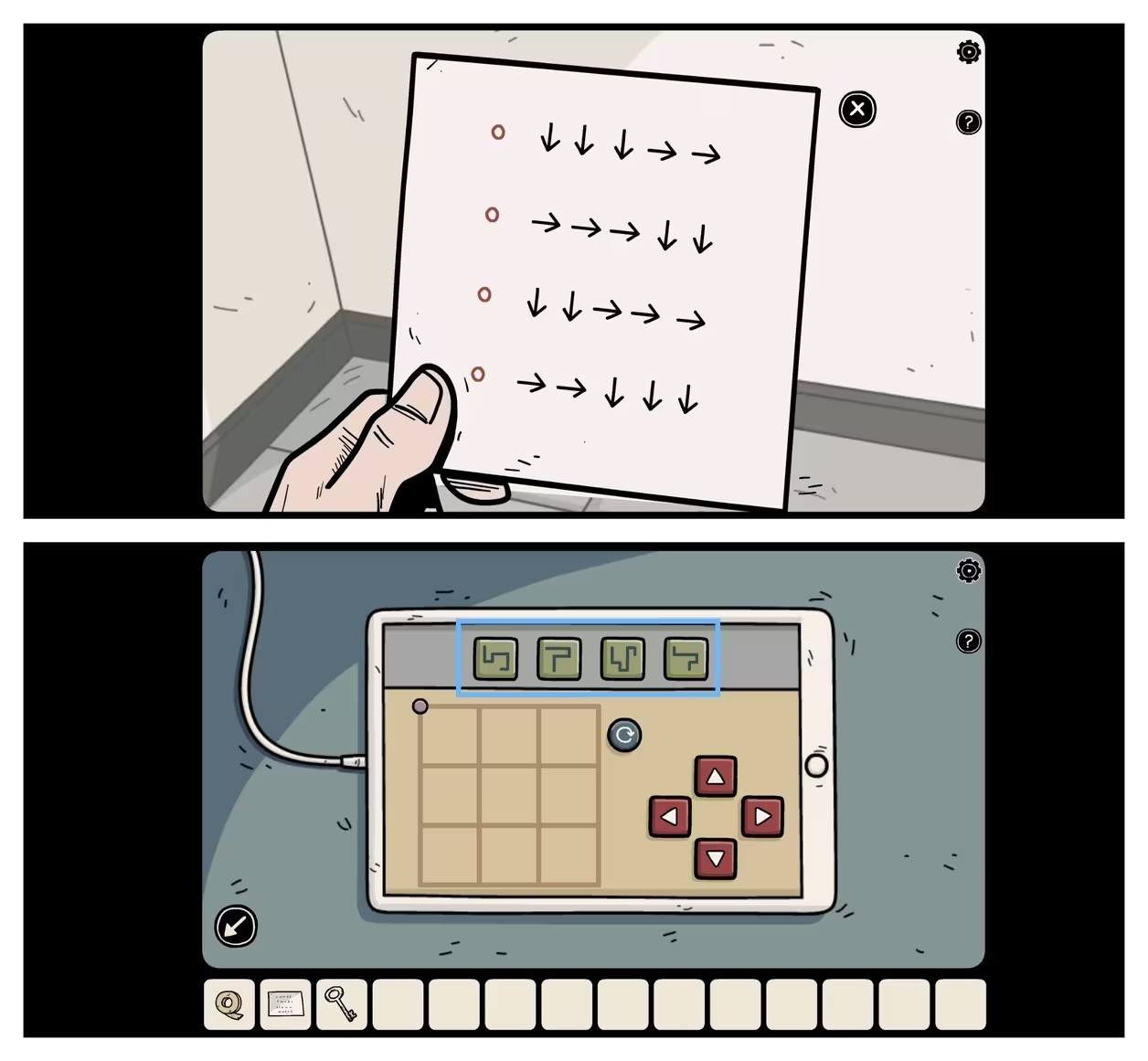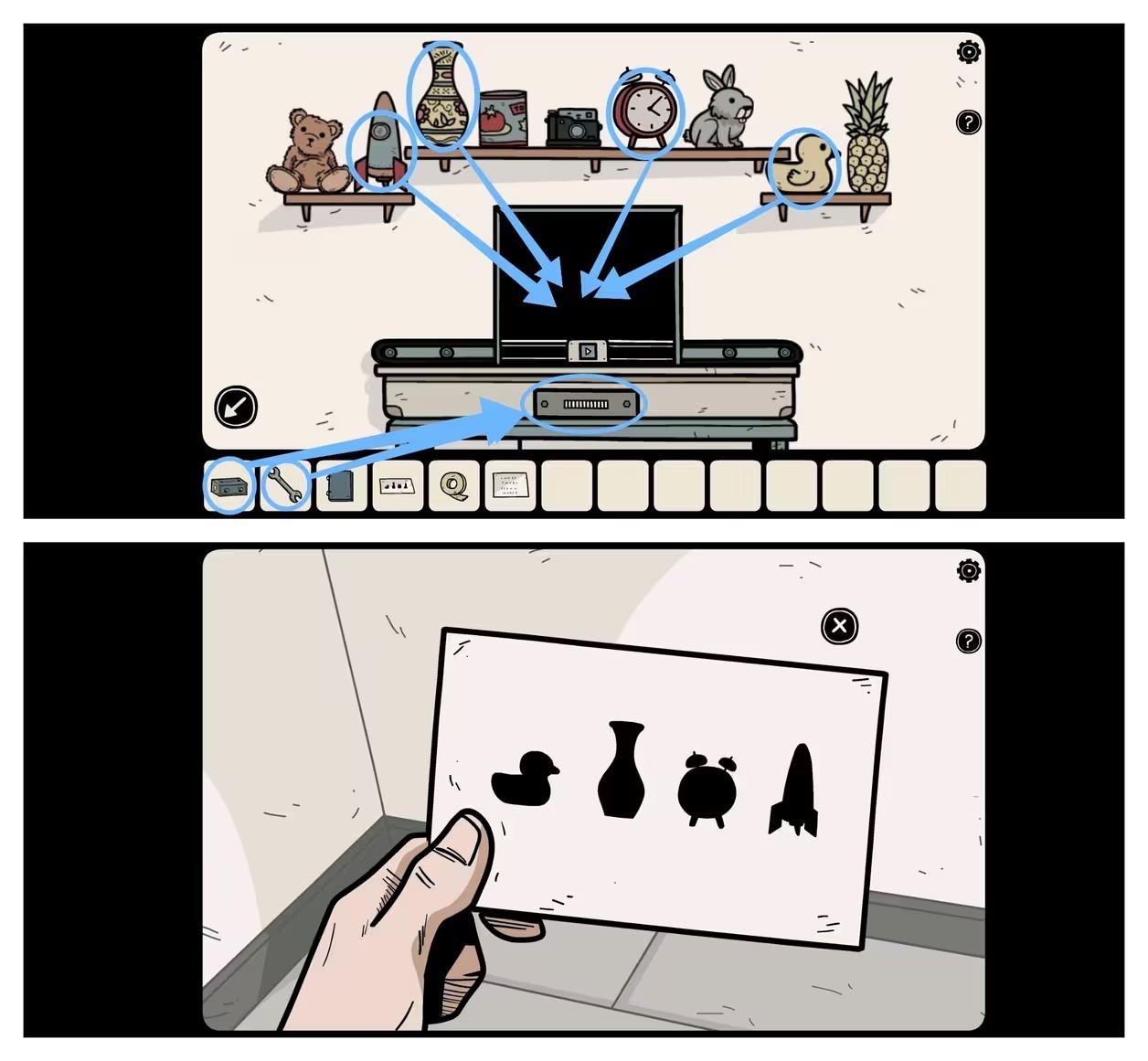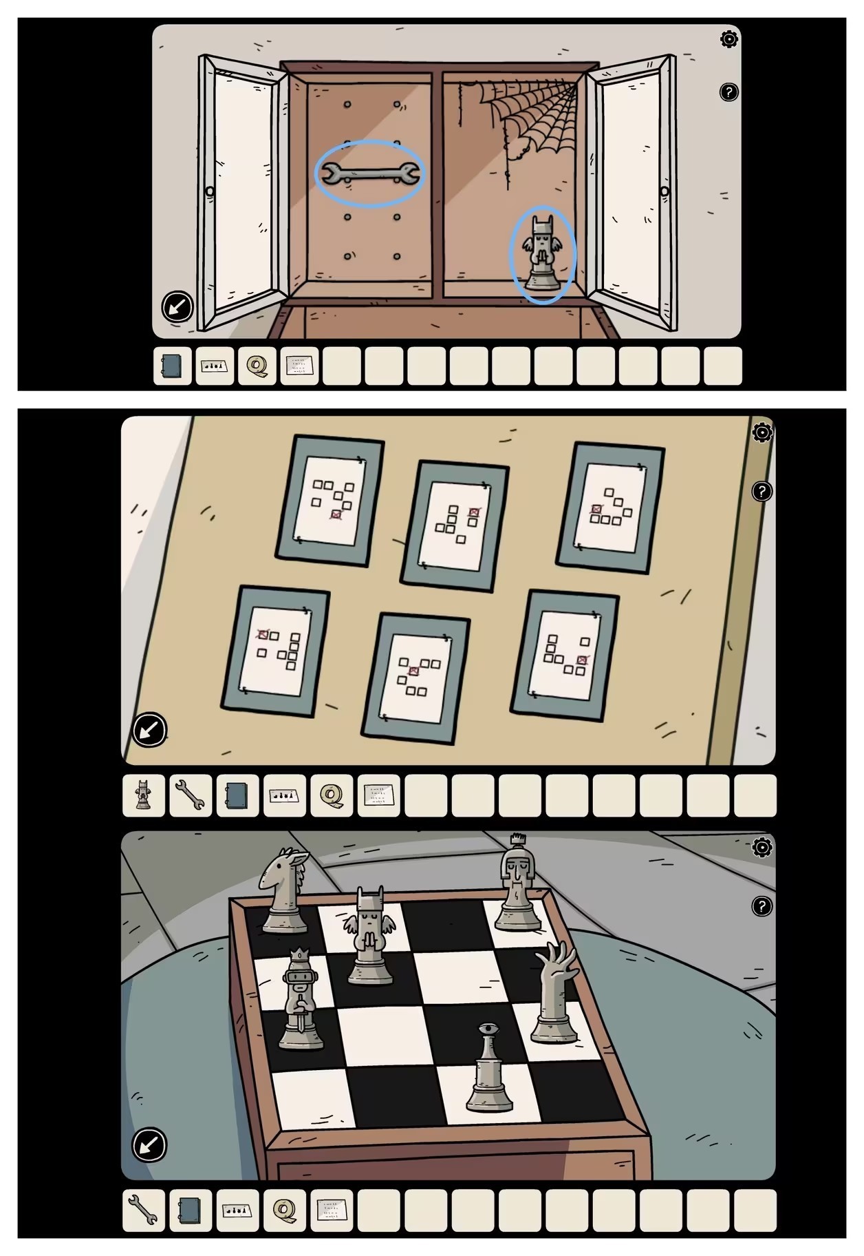 7、输入符号打开书柜拿到「扳手」和「棋子」,再观察留言板上的卡片(注意每个棋子对应的位置),接着将棋盘棋子放置正确的位置(如上图)获得「电池」