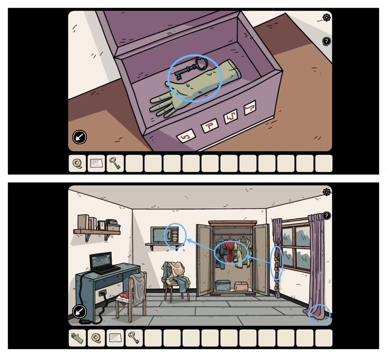 3、输入四个符号密码,打开客厅左侧的紫色的盒子拿到「手套」和「蓝色钥匙」,再用蓝钥匙打开二楼第一间房门,接着观察衣服以及窗帘打结的数量获得密码「1354」,最后打开保险箱获得「硬盘」