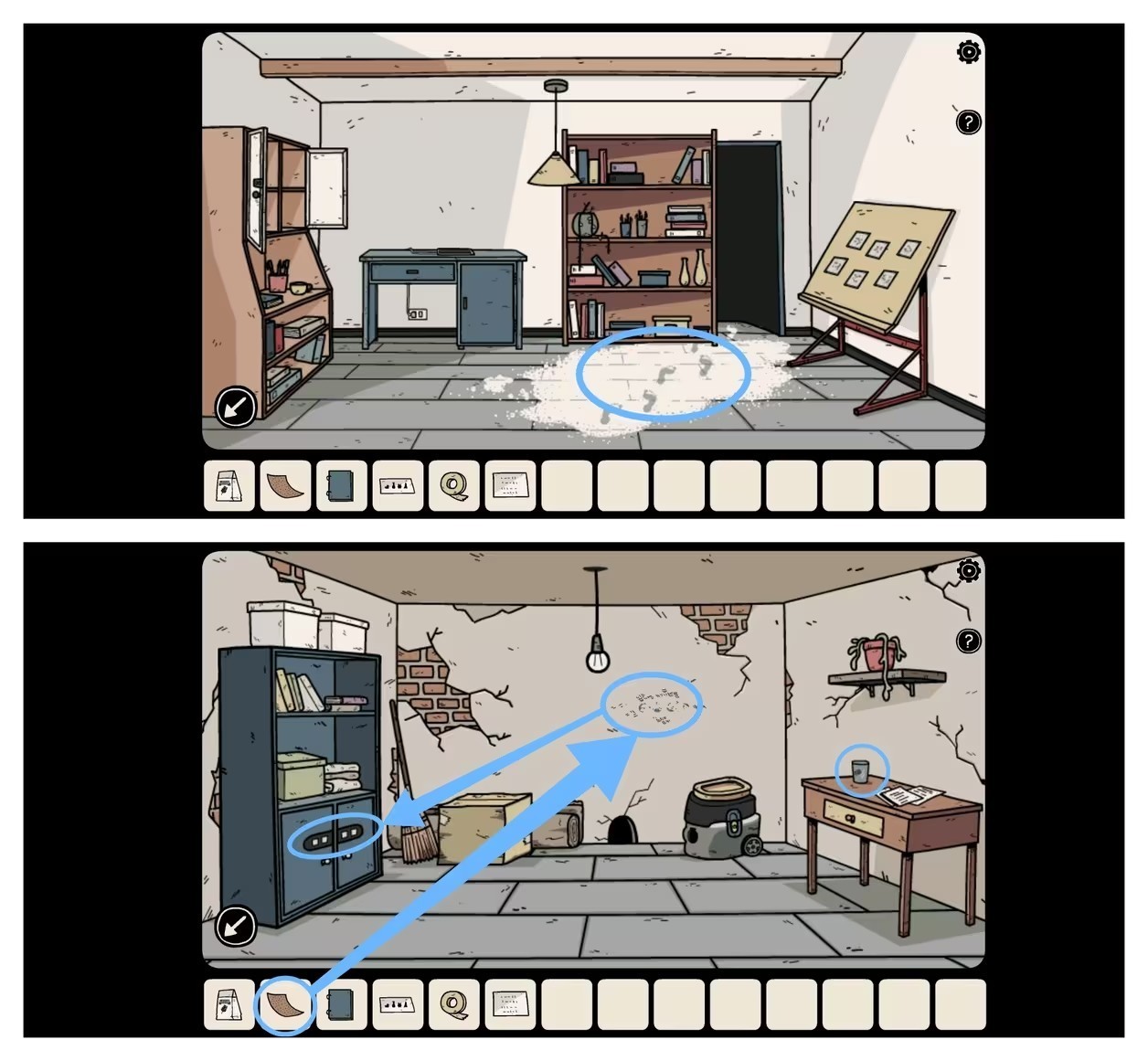 9、来到客厅触发剧情进入暗室,用砂纸清理墙壁上灰尘获得四个「图形密码」,接着打开左边的柜子拿到「毛刷」和「美工刀」
