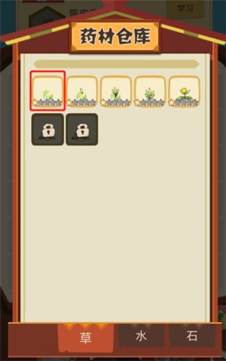 4、拖动屏幕上的药材,把三个相同的药材放在相邻位置,通过三合一小游戏生产药材。