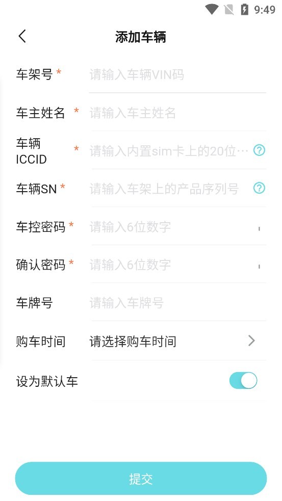 5、进入添加车辆页面,填写必填项并提交,完成车辆绑定。