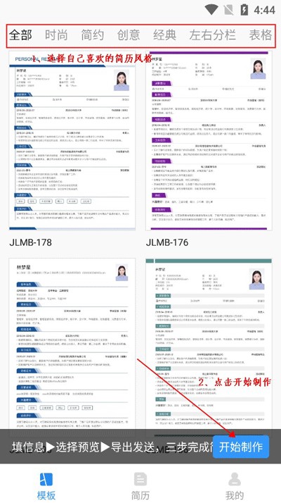 1、登录智能简历后,选择你需要的简历风格,点击右下角的【开始制作】进入简历制作页面。