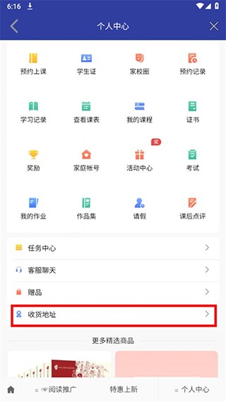 3、在个人中心页面,下滑找到“收货地址”并点击进入。