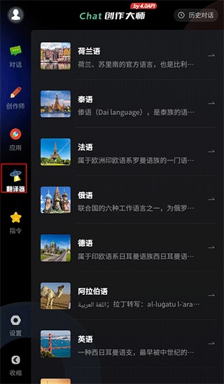 4、翻译器界面:支持多种语言翻译,包括荷兰语、泰语、法语、俄语、德语、阿拉伯语、英语、日语等。