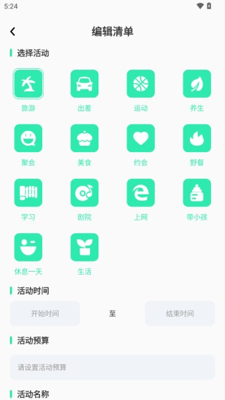 4、输入旅行的时间、预算和活动名称,并整理随行物品,确保一切准备就绪。