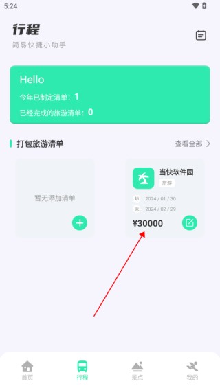 2、点击首页的“行程”选项,新增你的旅行计划。