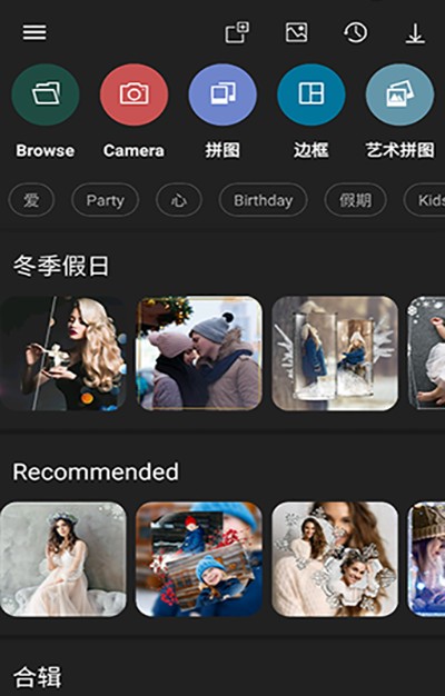 6、拼贴编辑器:多张照片组合成拼贴画,支持自定义背景、模板和形状。