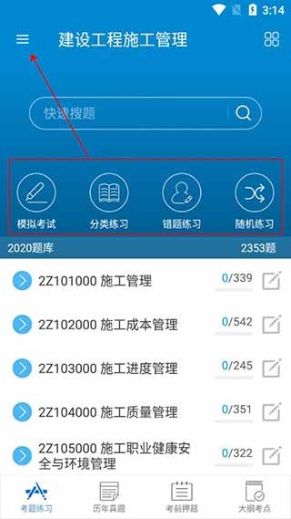 1、首先浏览二级建造师的功能,了解各项模块,点击左上角的三条横线进入菜单。