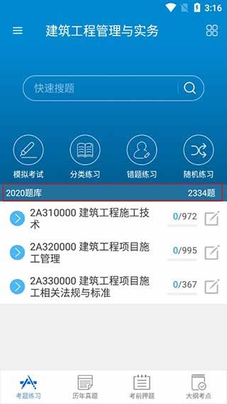 3、选择建筑工程管理与实务2020题库,共有2334题,涵盖不同领域,如建筑工程施工技术、项目施工管理等。