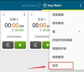1、打开多工计时器后,点击右上角的三个点标志,在下拉菜单中选择“设定”。