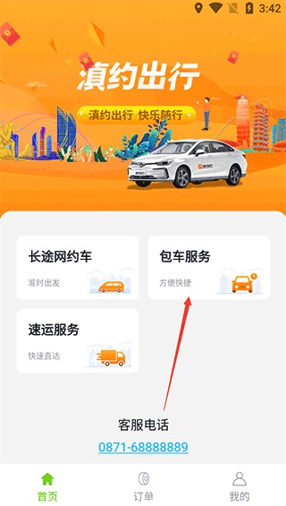1、打开滇约出行后,进入主页面。可以看到长途网约车、包车服务、速运服务等选项,选择包车服务。