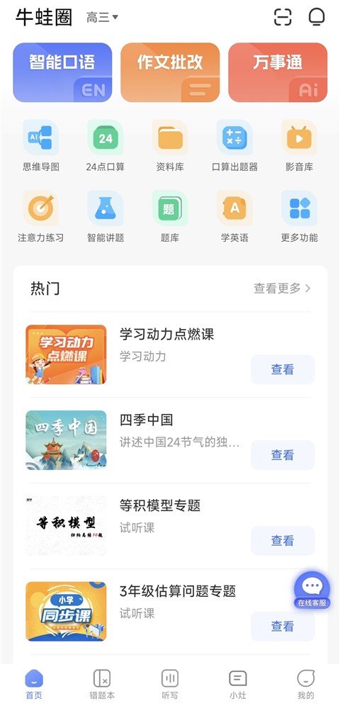 1、智能学习功能:支持错题管理、智能听写、错题复习,拍照记录错题并云端存储,方便随时复习。