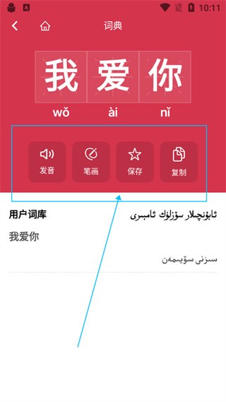 4、点击词汇后,你可以查看对应的发音、笔画和其他语言的翻译,方便学习。