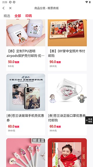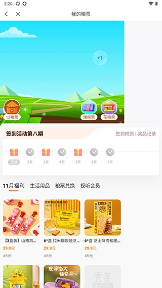 3、 兑换商品:可在“花粮票”栏目进入粮票商城挑选商品。