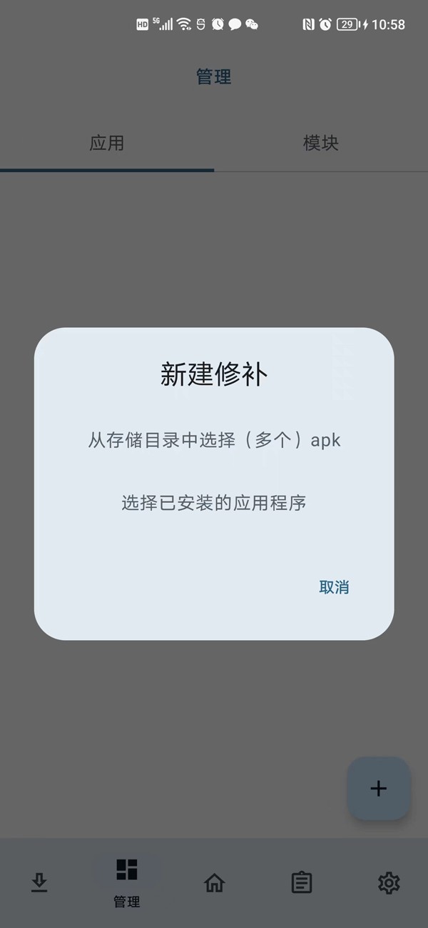 2、打开lspatch,进入“管理”页面,点击+ 号,选择存储修补后 APK 的目录。