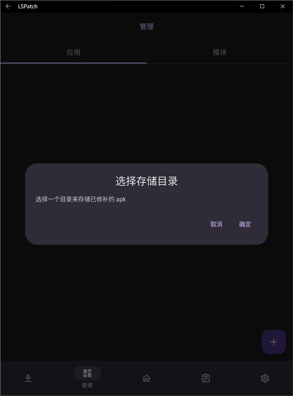 1、首次使用lspatch时,点击下方的【管理】按钮,选择加号。系统会提示选择一个目录来存储已修复的 APK,选择方便的位置并授予存储权限。