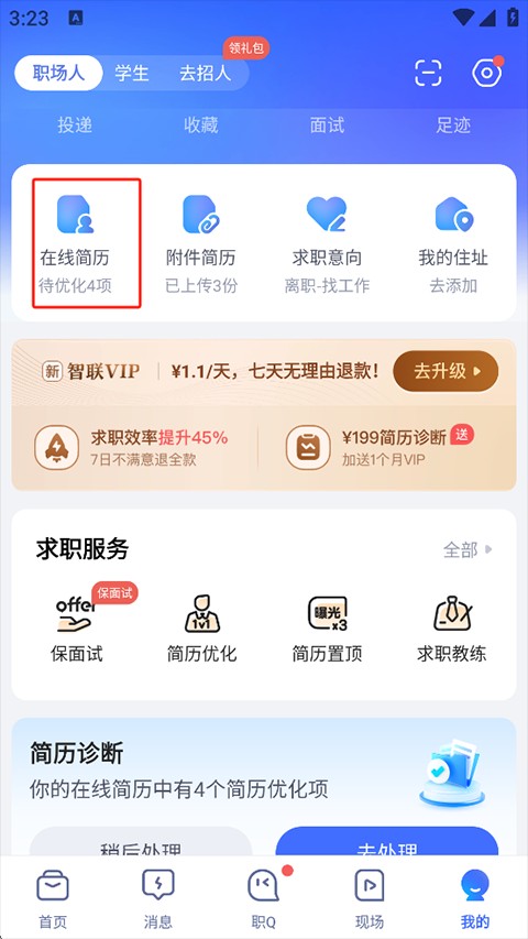 1、打开智联招聘,点击右下角【我的】,进入个人主页,选择【在线简历】。