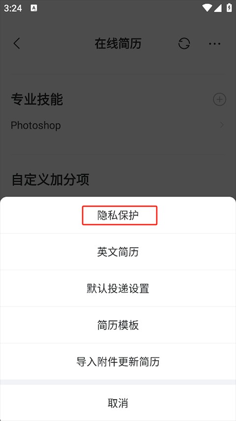 3、在弹出的菜单中选择【隐私保护】,进入【求职状态】设置。
