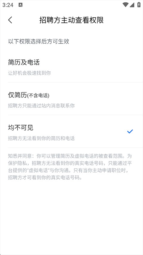 4、勾选【均不可见】,即可关闭求职状态,简历对企业不再展示。
