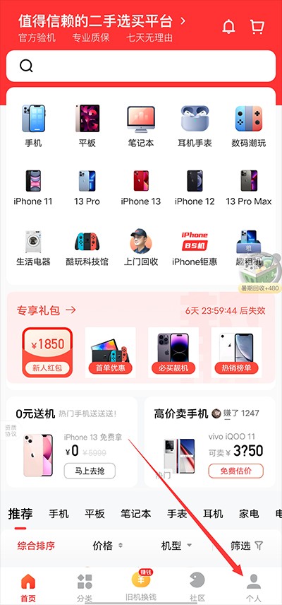 2、点击首页的“旧机换钱”选项。