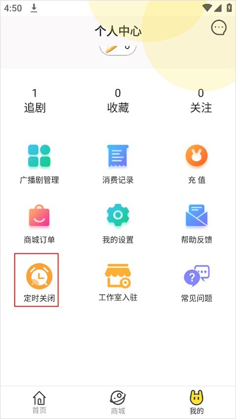 2、在“我的”页面中,找到并点击【定时关闭】选项。