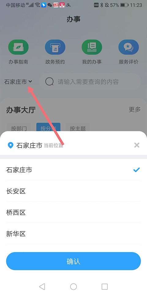 1、打开掌上石家庄后,进入【办事】页面,点击页面上方的搜索框。