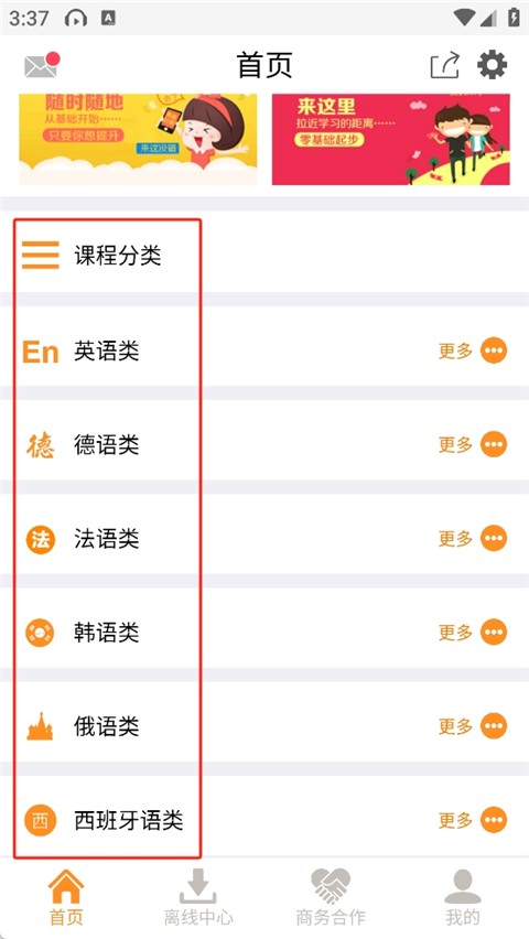 3、在首页选择语言或技能分类,点击进入即可学习课程。