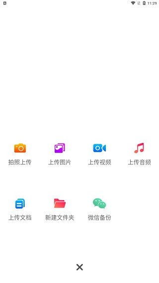2、选择上传内容:可以选择上传图片(支持多选或全选)、拍照上传、上传视频、音频、文档或新建文件夹等。