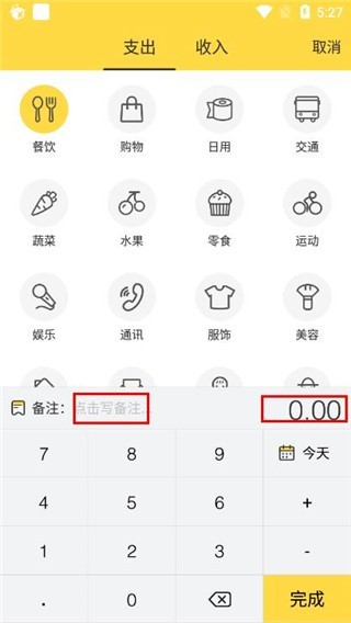 3、选择支出标签(如餐饮、购物等),输入金额和备注后点击确认。