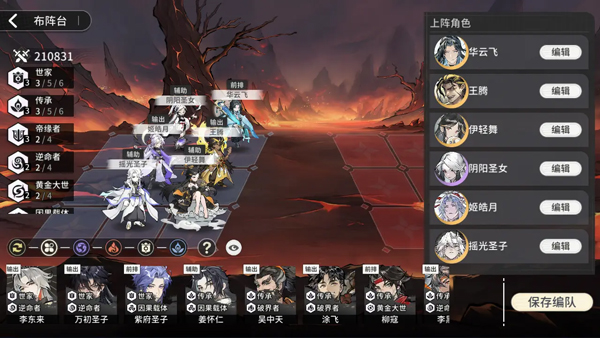 2、世家阵容:养成比较困难,3个SR都吃星,缺少AOE吃SSR群攻技能书,偏向PVP,2个前排很肉