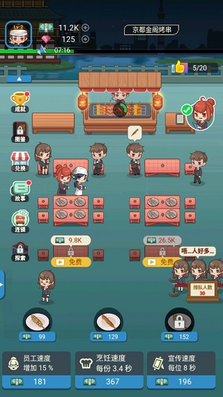 3、待顾客用餐完毕便需要服务人员的整理和打扫,玩家能够及时的点击餐桌上的盘碟可以整理的更快,如此便能接待更多的顾客。玩家还可以通过升级下方进行效率上的提升,比如增减员工速度,提升烹饪速度,增加宣传速度等