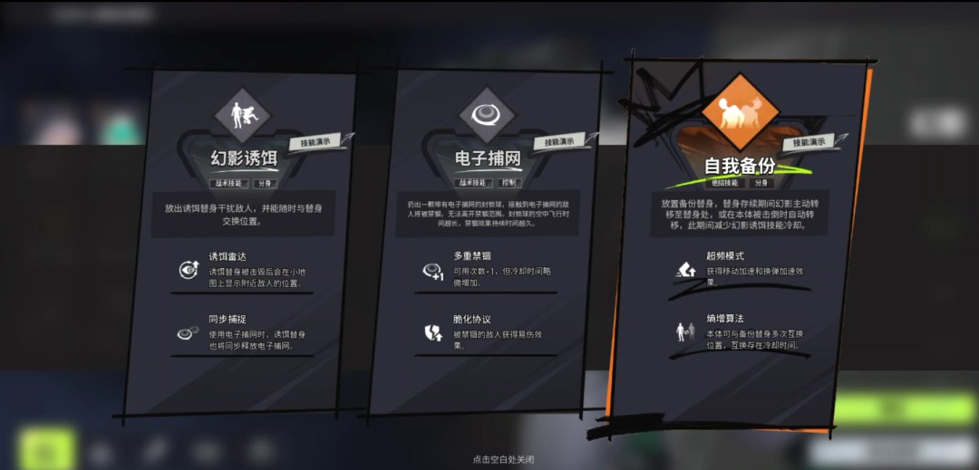 每个角色都有着2个战术技能,和一个绝招的技能组。随着局内的等级提升,我们还可以给这三个技能进行升级,每升一级都会给技能带来额外