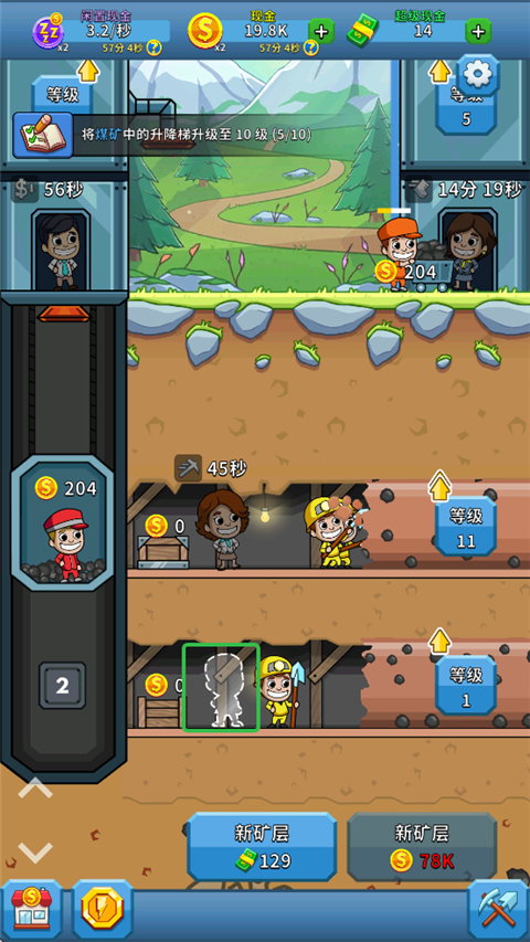 ※不断升级矿工、电梯与仓库容量,提高采矿效率与金币收益。