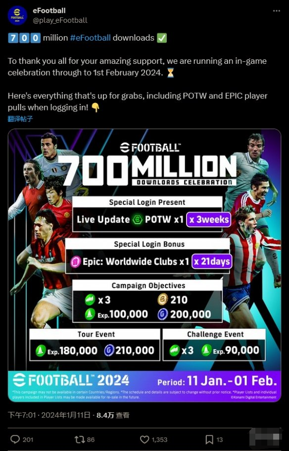 科乐美日前在游戏的官方推特账号宣布,《实况足球2024(eFootball 2024)》的全球总下载量已突破 7 亿次。