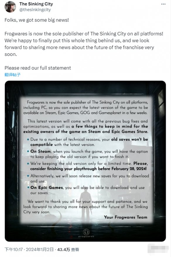 而Frogwares官方也同时宣布,《沉没之城》“很快”会登陆Epic平台,不过PlayStation和Xbox平台何时会重新上架本作,官方并未给出声明。