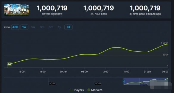 就在刚刚《幻兽帕鲁》Steam同时在线人数峰值突破100万!相比昨日在线人数几乎翻了一倍!(1月20日15点左右,《幻兽帕鲁》同时在线峰值为561032)。这样的数据实在太恐怖了。
