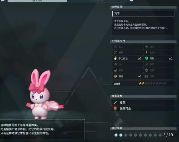 巧手:若它在队伍中无属性帕鲁的攻击力会有所提升。 若它在据点里,在武器制作台工作的效率会有所提升。 |