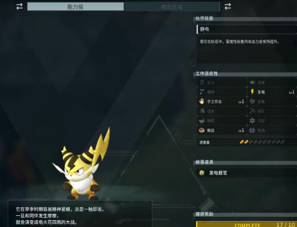 静电:若它在队伍中,雷属性帕鲁的攻击力会有所提升。 |