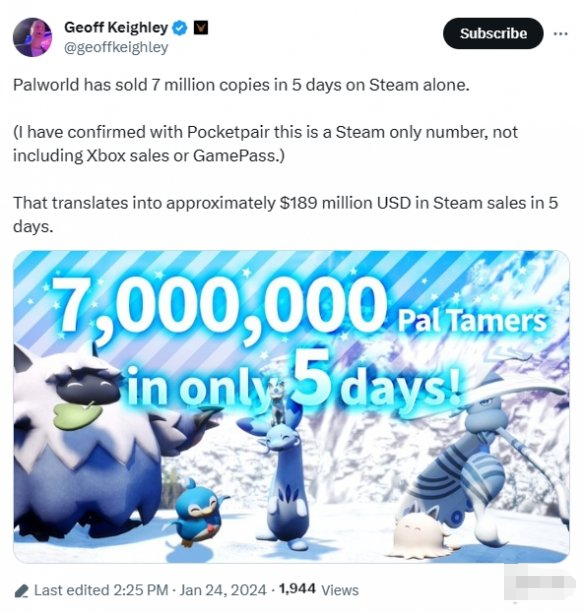 今天《幻兽帕鲁》官宣发售5天内销量破700万份,其销售速度已经超过《宝可梦:阿尔宙斯》(首周销量650万份)。TGA 创始人兼主持人Geoff Keighley 也随即发文为止震撼,并透露他已和开发商 Pocketpair确认过,该销量数据不包括Xbox 和 Game Pass 的销量。Geoff Keighley称,这意味着《幻兽帕鲁》在Steam发售5天内的销售额约为1.89亿美元。